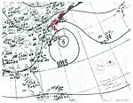 A tropical wave ascended to tropical storm status by 06:00 UTC on September 28 while located about 230 mi (370 km) south of Bermuda.[7] It moved northwest and then west-northwest, steadily organizing to attain peak winds of 65 mph (100 km/h) early on September 30. The storm then moved ashore the central coast of Maryland and was last distinguishable near Williamsport, Pennsylvania, around 00:00 UTC on October 2.[8] Considerable damage to crops, and lesser damage to structures, was inflicted throughout the Norfolk and Cape Charles, Virginia, areas, with damage estimated at $20,000.[10] Rainfall was generally light, peaking at 4.6 in (117 mm) in Diamond Springs,[9] but did result in some street flooding. A small ship and several small boats were sunk. Atlantic City, New Jersey, reported a maximum gust of 70 mph (113 km/h), and only slightly weaker gusts were recorded throughout Virginia. One death was reported.[10]
