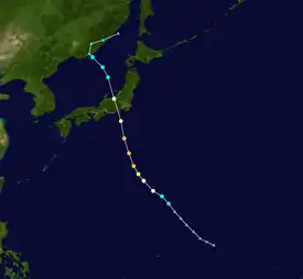 On August 1, a well-developed low pressure area and easterly wave accompanying the area was detected northwest of Guam. Following the discovery of an eye in the system, the area was designated as Tropical Depression Ellen by the JTWC at 06:00 UTC of August 2.[2] Ellen intensified into a tropical storm four hours later, before consolidating further into a typhoon 24 hours after. On August 4, as Ellen moved northwestward, the storm reached its peak intensity while located 320 km (200 mi) south-southeast of Okinawa, attaining winds of 185 km/h (115 mph).[17] Taking an erratic path, Ellen proceeded to decelerate off the coast of Kyushu. A strong ridge to the north prevented Ellen from further movement for approximately 46 hours. During that time, a recon aircraft measured the very large eye at 160 km (100 mi). The ridge then weakened, allowing the typhoon to accelerate in an east-northeast direction.[2] By August 8, Ellen had weakened into a tropical storm. Ellen moved along the south coast of Japan, passing directly above its capital city Tokyo. The storm entered the open sea east of Honshu on August 9, before transitioning into an extratropical cyclone.[17]