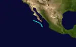 The last tropical cyclone of the season, Tropical Storm Tillie, developed on September 7. At first, the cyclone moved north-northwest;[3] Tillie reached its peak intensity of 60 mph (95 km/h) at that time of its formation approximately 150 mi (240 km) west of Mazatlan.[5] Early on September 8, while located about 100 mi (160 km) southwest of Cabo San Lucas, Tillie began a gradual turn towards the west-northwest. Tropical Storm Tillie dissipated at 0600 UTC on September 9[3] off the coast of California,[9] having only been a tropical cyclone for just over two days.[3]