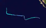 The first storm to make landfall, Katrina formed on August 30.[14] It became the third hurricane of the season 30 hours after it was named. The night that Katrina became a hurricane, it made landfall on the Baja Peninsula with winds of 85 miles (137 km) per hour. It emerged soon after and paralleled the peninsula until making landfall at the head of the Bay of California. It rapidly weakened to a tropical depression and dissipated over Arizona.[15][16] In Mexico, Katrina caused significant damage to parts of San Felipe. A total of 2500 people were left homeless and 60 ships were sunk. At least one person was killed.[17][18]