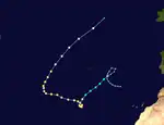 In late September, a cold-core low persisted off the coast of Portugal, moving southwestward. The system gradually developed tropical characteristics as it turned northwestward and executed a loop near the Azores. Eventually, the system organized enough to be designated as a tropical depression on October 4, while just east of the Azores. Shortly thereafter, the depression intensified into Tropical Storm Ivan.[43] However, the National Hurricane Center did not initiate advisories on Ivan until late on October 5.[44] Ivan moved largely in tandem with the upper-level low above it, while its southwest movement was caused by a building ridge to its north.[43] Late on October 5, an eye developed,[45] and Ivan was upgraded to a hurricane on the following day.[43]