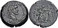 | avt k t aiλ aδp antѡnєinoc cєb єvcb around the laureate head of the emperor Antoninus Pius | l δєk-atov around the goddess Isis Faria on the bow of a sailing ship |
