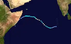 An area of convection formed west of Sri Lanka on October 31, organizing around a circulation center. Low wind shear allowed slow development,[25] and a low-pressure area developed on November 1 in the southeastern Arabian Sea. The following day, a depression formed off the southwest coast of India.[1] Moving northward, the system's convection continued to organize around the center, and the JTWC classified it as Tropical Cyclone 04A on November 4.[25] The IMD upgraded it to a deep depression on the next day as the storm began moving westward.[1] Despite good outflow, the convection failed to intensify further and was limited to the eastern portion, and the JTWC did not estimate 1 minute winds higher than 75 km/h (45 mph).[25] The IMD only assessed a peak of 55 km/h (35 mph).[1] Drier air from the north caused the thunderstorms to weaken and expose the circulation.[25] The IMD downgraded the system to a remnant low on November 7,[1] and the remnants continued to the west-southwest, passing near Socotra Island. On November 9, the remnant circulation brushed the coast of Somalia after redeveloping some convection, but there was no redevelopment.[25]