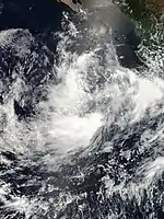 A tropical wave emerged off the west coast of Africa on June 2 and entered the Atlantic Ocean. Tracking westward, the system eventually reached the eastern Pacific on June 13. As it approached the Gulf of Tehuantepec, convection increased, despite strong wind shear. Early on June 16, sufficient development had taken place for the NHC to classify the wave as a tropical depression, at which time the depression was situated roughly 110 mi (175 km) south of Salina Cruz, Mexico. A scatterometer pass over the storm revealed it to have attained peak winds of 35 mph (55 km/h) later that day. Thereafter, wind shear took its toll on the system and its low-level circulation ultimately dissipated early on June 17 while still off the coast of Mexico.[29]