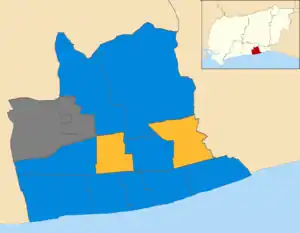 ![]() Map of the results of the 2011 Worthing council election. Conservatives in blue, Liberal Democrats in yellow and grey not contested. | |||||||||||||||||||||||||||||||||||||||||||||||||||||||||||