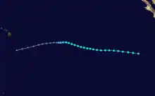 On July 25, the NHC highlighted an area well southwest of Baja California for potential tropical cyclogenesis over the following week.[102] A broad area of low pressure formed south of Manzanillo, Mexico two days later,[103] eventually gaining ample organization to be declared a tropical depression by 21:00 UTC on August 2.[104] The depression was upgraded to Tropical Storm Ivette twelve hours later as banding increased.[105] Despite initial forecasts calling for a strong Category 1 hurricane,[105] moderate wind shear only allowed the cyclone to attain peak winds of 60 mph (95 km/h).[106] Continued wind shear and a more stable environment caused Ivette to weaken to a tropical depression by 03:00 UTC on August 8 as it entered the Central Pacific;[107] 18 hours later, the system degenerated into a remnant low well east of Hawaii.[108]