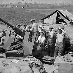 105th LAA Regiment was assigned to 66th AA Bde for the Italian Campaign. The brigade arrived in late 1943, and its first assignments were to protect the area round Salerno, where some of the initial landings had been made, and the airfields supporting the operations of US Fifth Army up the west side of Italy. As well as 105th LAA Rgt and two HAA regiments, the brigade included three US battalions equipped with Bofors guns. Further additions to its strength were made by January 1944.[6][19][20]