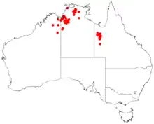 It is native to central Queensland around Mount Isa, through Arnhem Land in the Northern Territory[2] and the Kimberley region of Western Australia and grows in sandy soils on sandstone, around boulders and on rocky slopes.[1]