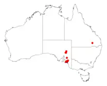 The shrub is scattered in an area of South Australia in the Murray region around Monarto and in the Flinders Range is often situated in gorges or on rocky hillsides growing in brown to grey calcareous loamy soils as a part of scrubby Eucalyptus woodland communities.[2]