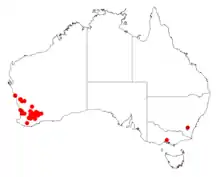 It has a scattered distribution from the Mid West, Wheatbelt, Peel and Great Southern regions. It is found as far north as Three Springs, south as Mount Barker and east as Lake Grace. It is found in swamps, on hill sides and among granite outcrops where it grows in sandy granitic or lateritic soils.[1]
