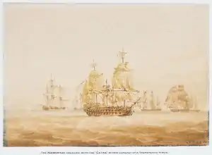 ![]() Agamemnon engaging four French frigates and a brig near Sardinia, Nicholas Pocock | |||||||