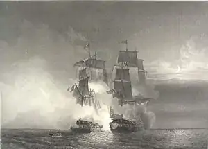 The frigates closed in to pistol range without opening fire.[20] As they passed each other, Aréthuse came about and fired her broadside at Amelia that cut the braces of her topsail; Amelia answered in kind, and then veered and abruptly decreased her speed, her davit touching Aréthuse at starboard.[13] Aréthuse fired another broadside at point-blank range, and for the following hour and a half, the two frigates remained entangled, exchanging volleys,[13] gunners from both sides snatching the ramrods of their opponents and duelling with sabres from one gunport and the other,[20] but neither side attempting to board the other.[13] After 90 minutes of cannonade and gunfire, Captain Irby and his two lieutenants, John James Bates and John Pope,[21] were wounded. The third lieutenant, George Wells,[21] was killed soon after taking command, and the master of Amelia, Anthony De Mayne,[21] replaced him.[13] Then, Bouvet attempted a boarding to decide the issue, but with her clewlines cut by shots,[13] Aréthuse could not maneuver.[20] At 21:00, the frigates separated.[2] The cannonade continued until 23:00, when the frigates lost contact.[2] Soon, a dense fog hid the frigates one from another, and it was not until the next morning that Amelia was spotted again. According to Bouvet's report, Aréthuse attempted to give chase, but to no avail.[2][13]