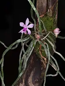 Aeridinae contains the largest diversity of leafless taxa within the tribe Vandeae. These leafless species of the genera Chiloschista, Phalaenopsis, and Taeniophyllum (syn. Microtatorchis[6]), which is the most species rich genus of Aeridinae with 245 accepted species,[7] exhibit reduced stems and enhanced importance and photosynthetic function of the root system. This extreme reduction of leaves has likely evolved in three to four separate instances within Aeridinae.[3][8] These leafless genera have a tight relationship with fungi of the Ceratobasidiaceae family.[9] The roots of leafless epiphytic orchids are also heavily colonized by nitrogen-fixating cyanobacteria, which are thought to supply the plants with nitrogen.[10]