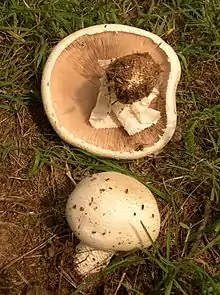 The white cap is hemispherical and white when young, but later flattens out up to 25 centimetres (10 inches) in diameter and becomes yellowish or tan. Its flesh is very thick. The gills are pinkish grey when young, and become brown with age. The spores measure 12 by 6 μm and are purplish-brown and almond-shaped. The stem is strong and thick, with a broad ring. It may measure 8 to 12 cm (3 to 4+1⁄2 in) in height and up to 3 cm in diameter.