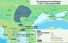 By the time the Agathyrsi were living in the Balkans, they had become a people of mixed Scytho-Thracian[70] origin, composed of a Geto-Thracian population[71] with an Iranic-Scythic ruling class,[69][72][19] as attested by how their kings, such as Agathyrsus and Spargapeithes, were Iranic.[73]