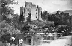 Once the entire force had converged near Wheeling, McDonald and Captain William Crawford directed the construction of Fort Fincastle in July 1774.[20][21] Following the erection of the stockade, McDonald ordered each of his soldiers to pack seven days' worth of provisions.[19] On July 26, 1774, his forces crossed the Ohio River at the mouth of Fish Creek about 24 miles (39 km) south of Fort Fincastle.[19][20] McDonald's forces continued down the Ohio River in boats and canoes until they reached the mouth of Captina Creek, from which they marched toward the Shawnee villages of Wakatomika (also known as Wapatomica) near the mouth of Wakatomika Creek (modern-day Dresden, Ohio) on the Muskingum River.[12][18][19] McDonald's forces had not encountered any enemy Native American forces on their expedition until about 6 miles (9.7 km) from Wakatomika, where they were ambushed by a force of approximately 30 to 50 Shawnee arranged in columns at the head of a swampy crossing.[15][18][19] The ambush resulted in the deaths of two soldiers and the wounding of up to eight or nine more.[18][19]