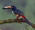 An aracari or araçari (US: /ˌɑːrəˈsɑːri/ AR-ə-SAR-ee,[1] UK: /ˌærəˈsɑːri/ ARR-ə-SAR-ee, /-ˈkɑːri/ -KAR-ee)[2] is any of the medium-sized toucans that, together with the saffron toucanet, make up the genus Pteroglossus.