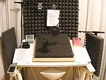 Producing an audiobook consists of a narrator sitting in a recording booth reading the text, while a studio engineer and a director record and direct the performance.[31] If a mistake is made the recording is stopped and the narrator reads it again.[31] With recent advancements in recording technology, many audiobooks are also now recorded in home studios by narrators working independently.[32] Audiobooks produced by major publishing houses undergo a proofing and editing process after narration is recorded.