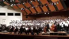 In the 1980s, the acoustics engineer Leo Beranek, who contributed to the project, ranked the hall in the world's top five concert halls for its acoustics.[9][12] It is so ranked thanks to the 1953 Flying Saucers or Floating Clouds artwork developed by Alexander Calder, a system that combines technology and art.[2][9] These structures were installed on the ceiling under the supervision of the American firm Bolt, Beranek and Newman, and adjusted while an orchestra played on stage to calibrate the acoustics and make sure the quality remained consistent throughout the hall.[1][13] The clouds are the most prominent example of the philosophy of the project to combine art and thought as well as function.[4][14]
