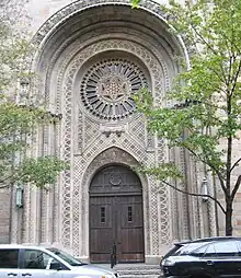 In 1864, the congregation moved yet again, to a new building on 34th Street,[2] the parcel later became part of the site of the flagship Macy's store. Driven by the rapid expansion of the city, they moved yet again in the spring of 1885 to Madison Avenue at 65th Street. That building was designed by Rafael Guastavino and Schwarzmann & Buchman.[16] Less than a year later, a fire did extensive damage to the building.[17] Reports rated the damage at $35,000.[18][19] B'nai Jeshurun was temporarily relocated to Congregation Ahawath Chesed, now Central Synagogue, on Lexington Avenue, which ironically had a fire of its own within the month, leaving both congregations homeless.[20]