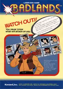 Badlands (バッドランズ) is a video game released and developed by Konami on the LaserDisc system in 1984 and published by both Konami and Centuri. It debuted at the Amusement and Music Operators Association (AMOA) Show in October 1983 and was later released to the public in early 1984.[2][3] In addition to its LaserDisc version, two versions of a Badlands video game cabinet exist, one produced by Konami, and one by Centuri.