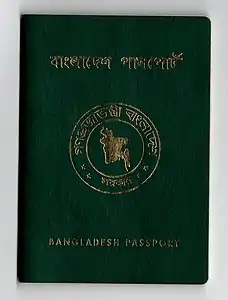 After the Bangladesh Liberation War, Act Number 9 of 1973 (called The Bangladesh Passport Order, 1973) which was signed into law by the President of the People's Republic of Bangladesh, on 8 February 1973, lead to the creation and issuing of the first passport of newly independent Bangladesh.[1] These passport booklets were traditional, handwritten or manual, passports and were compliant with the relevant international laws and regulations in force at the time. Subsequently, additional laws were enacted in Bangladesh in the years that followed to improve the passport application process; enforce the ineligibility to hold multiple valid Bangladeshi passports; citizenship requirement for a passport; etc. Since 1972 a special passport, also known as the India-Bangladesh Special passport, used to be issued to Bangladeshi citizens and Indian nationals resident in West Bengal State and the North-Eastern States of India only. This special passport had a maroon cover. It was valid for travelling between India and Bangladesh only. The issuance of this passport ended in 2013 due to changes in ICAO regulations.[9][10]