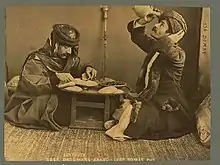 Lebanese Arabs drinking out of a Briq and eating a mezze, 1889