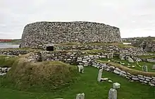 The broch has an external diameter of around 20 metres and an internal diameter of around 9 metres. It is surrounded by a stone-walled fort consisting of a blockhouse and ringwork.[2] The blockhouse is a free-standing drystone gateway set just within the entrance to the fort.[3] Access to the broch is achieved via the entrance on the western side.[3] The entrance passage may have had a "guard cell", now blocked up, on the right side, just inside the door jamb. The interior of the broch has two cells within the walls at ground-level.[3] Excavations have revealed the postholes for internal timber buildings and in the 19th century there were said to have been radiating stone piers visible.[3] There are two additional entrances to the broch at upper levels.[3] The north entrance leads both into the interior and to a staircase. The other entrance leads to an intramural gallery.[3]