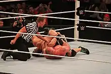 At SummerSlam on August 17, Lesnar defeated John Cena to win the WWE World Heavyweight Championship; during the match he delivered sixteen suplexes (most of which were German suplexes) and two F-5s to Cena, who barely managed any offense.[113] In a rematch at Night of Champions on September 21, Lesnar was disqualified due to Seth Rollins interfering, but retained his championship.[114] Later in the year, Rollins reunited with The Authority and was added to Lesnar and Cena championship match at the Royal Rumble on January 25, 2015, making it a triple threat match,[115] which Lesnar won despite (storyline) breaking a rib during the match.[116]