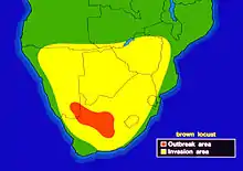 The brown locust (Locustana pardalina)[1] is a medium-sized small locust species in the monotypic genus Locustana.[2][3] It is found in Southern Africa and shows classic gregarious behaviour with phase polymorphism on crowding.[4]