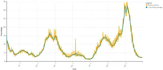 On October 31, the 7-day test positivity rate was 6.9%.[46] Two restaurants in Cleveland were cited for violating health orders with large Halloween gatherings.[47]