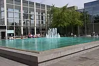 The cool, elegant, steel framed design was influenced by the architecture of Ludwig Mies van der Rohe[9] and echoed glazed shopping streets or arcades on the grand scale of the Galleria in Milan. The designer, Derek Walker, also likened it to the Crystal Palace.[10] It was described in 1993 as "still the best-looking if no longer the biggest shopping centre in the British Isles".[8] It is unusual for second generation shopping centres in Europe for the amount of daylight allowed into the public areas, for the rigorous control of retail facias along the arcades themselves, for its public art, the unusually high level of accessibility for visitors with limited mobility (and other users laden with children and shopping), the lavish extent of the public spaces and their interior planting (reduced since the buildings was completed) and for the cool mirrored exterior.