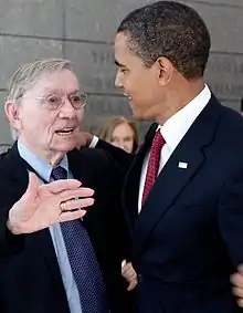 Payne appeared in the visitor's gallery at the Democratic National Convention in Denver, Colorado, when his grandnephew was nominated for president.[10] He was the assistant director of the University of Chicago Library.[7] Payne died on August 1, 2014, aged 89.[11][12] On August 5, 2009, Obama visited the former Buchenwald concentration camp near Weimar, Germany, to learn more about the history of the site and of the experiences of his granduncle. In his speech, Obama said, he heard from this place yet as he was a boy - from Charles T. Payne.[13] Payne was longtime close friends and shared the same dormitory for six years with the former Vice President and Premier of the Republic of China (Taiwan), Dr. Lien Chan.[14]