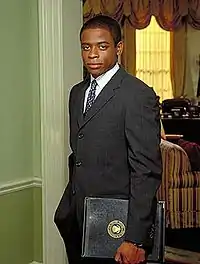 The character of Charlie Young was originally to appear in the pilot, with a draft dated February 6, 1998, describing him as a "fresh-faced" 19-year-old who is taking a year off from Georgetown University to work as the President's personal aide.[1] The character was written out of later drafts, and was not introduced in the show until The West Wing's third episode after the all-Caucasian main cast came under criticism from the NAACP.[2] Aged 21 when he enters the White House, the character that made it into the show is slightly older than the early pilot draft called for, and has a somewhat modified history.