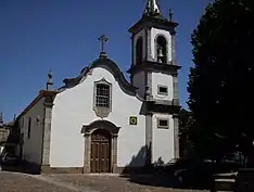 In the body of the nave (divided into two registers), there appears, on the first, an adjoining annex and in the upper two, arched windows.[1] The volume of the main chapel also includes an attached/adjoining annex and in the upper register, two straight windows, decorated by cornices.[1] The north facade, in the body of the nave, is a straight portal and half-cane frame surmounted by a protruding frieze and bowed arch with straight window, decorated by the coat-of-arms.[1] In the volume of the chancel, the sacristy appears with two straight windows, decorated with cornices. The blind eastern wall is topped by gable with cornice.[1]