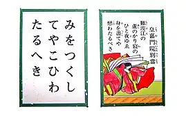 - Yomifuda (lit. "reading card"); 100 cards, each with a picture of a poet with a complete tanka poem (5-7-5-7-7 syllables) by them.