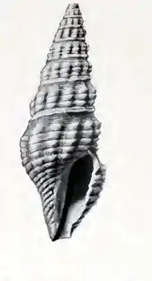 Sculpture.- The external sculpture is vigorous, both axial and spiral. The axial ribs are rather strongly elevated, rounded, somewhat undulatory and slightly protractive, 12 to 14 in number on the later whorls, persisting with undiminished strength to the anterior suture but quite abruptly evanescent posteriorly at the margin of the fasciole. On the body whorl they are weakening a little in front of the periphery and becoming obsolete before reaching the pillar and, in the older forms, irregular or altogether obsolete toward the aperture. Intercostal areas are concave, narrower than the ribs. The spiral sculpture consists of broadly arched, rather prominent, primary fillets, uniform in strength on both the costal and the intercostal areas, 9 to 11 in number on the ultima, 3 or 4 upon the penultima, usually, though not always, equal or sub-equal in size and spacing. The intercalaries are absent in the type but present, as a rule, to the number of 1, 2, or 3 between the primaries of the later whorls. The posterior fasciole is obscurely undulated anteriorly by the axial sculpture, spirally threaded with 4 to 6 fine, close-set lirae with 1 or 2 stronger cords at the posterior margin, directly in front of the suture line. The anterior canal is sculptured with 4 to 6 crowded lirae. Aperture : the aperture is narrow, obliquely lobate, obtusely angulated at the posterior commissure. The outer lip is somewhat flaring. The posterior siphonal notch is very narrow, but rather deep. The inner lip is gently excavated at the base of the body whorl. The columella is straight, moderately long, simple. The parietal wall and the columella are heavily reinforced. The anterior canal is rather long and broad, obtusely truncate at the extremity.[2]