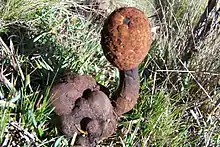 Corynaea crassa is a root hemiparasite of a broad variety of plants, thus requiring no sunlight to gather nutrients and lacking leaves. The vegetative body of the plant, and akin other members of the family Balanophoraceae, consist of an accretion of plant tissue known as a haustorial tuber. It is this haustorial tuber where the inflorescences of the plant develop from. The size of the haustorial tuber is directly correlated to the diameter of the host root from which the tuber derives its nutrients. In addition, the number of inflorescences the tuber produces is directly correlated to the diameter of the tuber itself.[11] The emergence of the inflorescence is seasonal.[8] The individual flowers are pollinated by insects of the orders Hymenoptera and Diptera.[11] The rhizome of C. crassa is irregular in shape, with multiple lobes. It turns a rusty color when dried.[12] The inflorescence is typically pink in color, ranging between a yellowish-brown to an intense purple,[13] with the peduncle, or stalk of the plant, having an irregular short and lobed sheath at its base and having a length of 1.5–2.5 centimetres (0.59–0.98 in).[12] The flower head is globose in shape, tapering to become fusiform in shape.[12] The flower heads have a length of between 2–4 centimetres (0.79–1.57 in) and a diameter of between 1.5–2.0 centimetres (0.59–0.79 in).[12] The individual fruits are obovoid, or egg shape, and around 1.5 millimetres (0.059 in) in length and 1 millimetre (0.039 in) in width.[12]