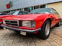 The Longchamp was derived from the De Tomaso Deauville four-door saloon, using a shorter wheelbase chassis with the same suspension, engine and transmission. The same platform underpinned the Maserati Kyalami grand tourer and the Maserati Quattroporte III saloon as Maserati was owned by De Tomaso at the time. The Deauville and the Longchamp were the only front engine production cars produced by De Tomaso. The Longchamp was first exhibited at the 1972 Turin Motor Show[2] and was initially offered only as a 2-door 2+2 coupé. It was designed by Tom Tjaarda of Ghia and was influenced by his previous Lancia Marica prototype. The taillights were the same units as were used for the Alfa Romeo 1750/2000 saloon.[3] The headlights and front indicators are from the Ford Consul/Granada. The name Longchamp is likely a reference to the Longchamp Racecourse in Paris and/or Longchamps, Buenos Aires, a city near de Tomaso company founder Alejandro de Tomaso's birthplace.