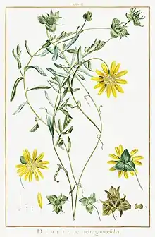 The first to describe species that are nowadays included in the genus Didelta was Carl Linnaeus the Younger in 1781 and he named them Polymnia carnosa and Polymnia spinosa. The type species of that genus is Polymnia canadensis, named by his father Carl Linnaeus in 1758. Polymnia is however a rather unrelated plant from North America in the Heliantheae-tribe, with which it shares broad outer involucral bracts. The French naturalist Pierre-Joseph Buc'hoz described in 1785 Breteuillia trianensis, based on a plant that was growing in the botanical garden at the Palace of Versailles. In 1786, Charles L'Héritier described Didelta tetragoniifolia, based on the same plant from Versailles. In his Hortus Kewensis published in 1789, the Scottish botanist William Aiton reassigned P. carnosa and P. spinosa to Carl Peter Thunberg's genus Choristea. Joseph Gaertner created in 1791 the new genus Favonia for P. spinosa. Friedrich Wilhelm Klatt redescribed Polymnia carnosa in 1886 and named it Distegia acida.[1] These generic names have been regarded as synonyms by most later botanists.[8] Although Breteuillia is an earlier and validly described name, it was ignored by later botanist, and therefore it was suppressed in favour of Didelta.[9]