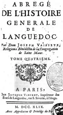 At the age of 26, on July 11, 1711, he entered the Benedictine order in the Monastery of La Daurade, in Toulouse.[5] Shortly after, he received the news of his father's death.[4] In 1713, Vaissète's superiors called him to the Abbey of Saint-Germain-des-Prés in Paris because of his taste for history.[5] In 1715, he was charged with co-authoring a history of Languedoc with Dom Claude de Vic.[2] [The two authors were able to use the prior work of Dom Gabriel Marcland and Dom Pierre Auzieres, two learned and capable scholars who had separately worked in the province for several years, combing the libraries for material and making considerable progress in organizing the material had not been able to continue due to their advanced age or other jobs.][6] The first volume of the Histoire générale de Languedoc appeared in folio in 1730. Dom de Vic died in 1734, leaving Dom Vaissette in sole charge of the great work, which he successfully executed. The work was published in four more volumes, the fifth appearing in 1745. Dom Vaissette published a four-volume universal geography in 1855.[2]