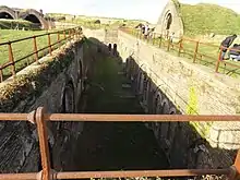 The entrance to Drop Redoubt was via a bridge. The inner third of this was pivoted so that the Redoubt could be isolated. The pivot and the recess into which the bridge swung can still be seen, although the bridge has long since gone.[10] In the 1980s, a temporary scaffolding bridge was built by the army to enable access for guided tours of the Redoubt, but this was removed in the middle 1990s to prevent unauthorised entry and vandalism.
