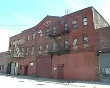 72–74 Kent Street, a three-story brick factory in the Renaissance Revival style, was erected around 1904–1908.[39] Measuring nine bays wide, it contains a central pediment upon which the company's motif was placed. It contains projecting greystone window sills, lintels above the windows, and a brick corbel.[40] Two fire escapes are located on the building's facade, one shared with its eastern neighbor, 76 Kent Street.[39] As of 2018 this space is partially occupied by the New York University School of Medicine as a physical therapy and imaging center.[28]