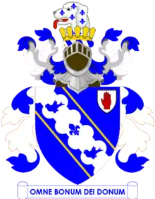 | Blazon | Azure on a bend nebuly Argent cottised Or a fleur-de-lis between two martlets of the field |