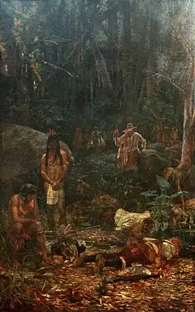 There were too few Portuguese men to conquer the vast lands of Brazil by themselves[45] and almost no Portuguese women[46] went there at first. In effect, sectors of the indigenous people were co-opted. The country was opened up by bands of entrepreneurs.[47] The most famous of these are the bandeirantes, who searched for wealth: Indians to enslave, gold or diamonds. Though generally loyal to the Portuguese king, most bandeirantes were mamelucos (of mixed race) or perhaps Indians; illiterate; and extremely poor;[48] speaking Tupi rather than Portuguese amongst themselves.[49] Some bandeira commanders were black. The wilderness — where they endured severe hardships, and where they hoped to find riches — gripped their imagination.[50][51] Bandeirismo in one form or another was to persist into the 19th century.[52]