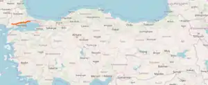 European route E 84 is a road part of the International E-road network. It begins in İpsala border gate (to/from Greece) in Turkey and run through Keşan, Malkara, Tekirdağ and Marmaraereğlisi and ends in Silivri, Turkey.
