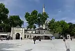 From the outside, a large outer courtyard of irregular shape leads to an inner rectangular courtyard. An elevated, enclosed corridor running along the south side of the outer courtyard was originally the sultan's private entrance to the mosque and to his loge (private screened balcony) inside the prayer hall.[21] The şadırvan (ablutions fountain) is located in this courtyard.[7] The inner courtyard grants access to the mosque on one side and to the shrine of Abu Ayyub al-Ansari on the other. An old plane tree[9] stands in the middle of this courtyard on a rectangular platform or parterre with Baroque marble fountains at its corners. This platform was formerly where Ottoman sultans were girded with the Sword of Osman upon their accession to the throne.[1] A portico of arches and domes runs around three sides of the courtyard, preceding the entrance to the mosque.