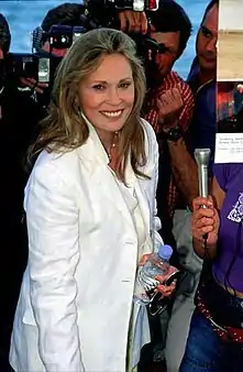 In 2011, a photo of Dunaway taken by Jerry Schatzberg in 1970 was chosen as the 64th annual Cannes Film Festival poster backdrop. The festival organizers described it as a "Model of sophistication and timeless elegance, it is an embodiment of the cinematic dream that the Festival de Cannes seeks to maintain".[30] During the festival, Dunaway and Schatzberg appeared at a special screening of Puzzle of a Downfall Child, earning a standing ovation upon their entrance. In 2013, Dunaway was the first recipient of the Leopard Club Award and made a rare personal appearance at the Locarno International Film Festival to accept it.[94] In 2014, Dunaway was recognized as the guest of honor by the Lumière Film Festival. Organizers praised the "immense contribution she has made to the emergence of the independent American films of the sixties and seventies, and the contribution is of the highest caliber".[95] Her attendance at the festival was described as an "exceptional event". Dunaway received a standing ovation by a crowd of 5,000, and declared in an emotional speech following the tribute she received, "My fans and my friends have supported me in this search for all these years, and I thank you from all of my heart, and without you, I would not be the same Faye Dunaway."[96] In 2014, Dunaway had to pull out of a French drama called Macadam Stories, in which she was going to play the lead, due to health issues, and was replaced by Isabelle Huppert.[97] The following year, it was announced that Dunaway was writing a book about her experiences making Mommie Dearest but the project never materialized.[98]