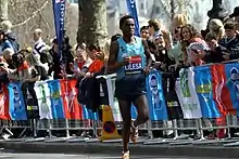 He improved further at the Xiamen International Marathon in January 2010, breaking Samuel Muturi Mugo's year-old course record with a time of 2:08:47 to gain his first win at a major marathon.[12] He knocked a significant margin off that time at the Rotterdam Marathon, where he finished in 2:05:23. This time made him the third fastest Ethiopian (and non-Kenyan runner) ever behind compatriots Haile Gebrselassie and Tsegay Kebede. However, this time only brought him fourth place in Rotterdam as the competition was one of the strongest ever—podium finishers Patrick Makau, Geoffrey Mutai, and Vincent Kipruto all moved into the top-10 all-time fastest marathon runners.[13] He ran at the 2010 Chicago Marathon in October and kept pace with the race leaders, Tsegaye Kebede and Samuel Wanjiru, up to the 20-mile mark. He faded behind them afterwards, however, and finished in third with a time of 2:08:10.[14] Feyisa Lilesa was among the earlier front runners of the Delhi Half Marathon the following month, but eventually finished in fifth place.[15]
