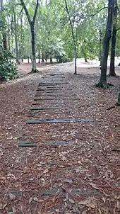 The 2 ft 6 in (762 mm) narrow-gauge Fort Wilderness Railroad (FWRR) began operating on a trial basis in late 1973 and officially opened on January 1, 1974.[1][2] Along its 3.5-mile (5.6 km) route, the railroad provided transportation for the various campsites within Walt Disney World's Fort Wilderness Resort & Campground, as well as the nearby Disney's River Country water park. Due to issues with track maintenance, pedestrian safety, noise concerns, and its locomotives' low fuel capacity, the railroad only operated occasionally after 1977 and closed permanently in February 1980.[3][4] Railroad ties remain in place along certain sections of the railroad's former right-of-way.[5] The FWRR's roundhouse was also converted into a laundry facility.[6]